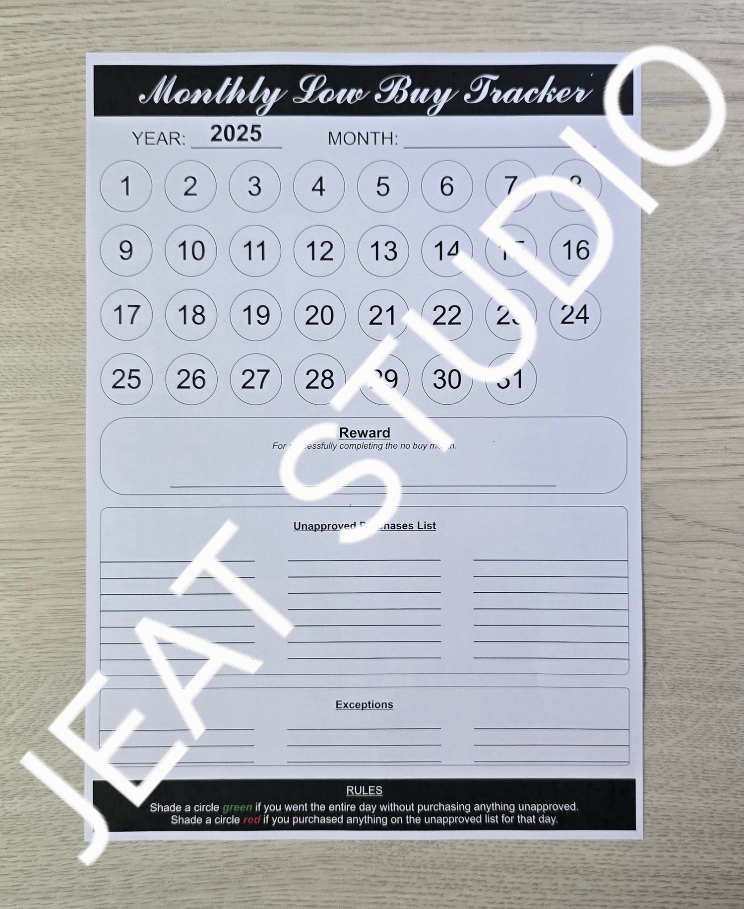 Track and achieve your budget goals with the Low Buy Tracker. Set monthly spending parameters and mark your progress with a simple green/red circle system. Plus, reward yourself for successfully sticking to your budget. Stay on track and save money with ease.